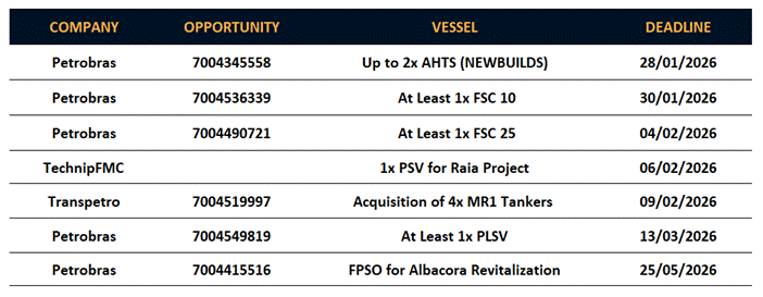 - Petrobras At least 1x PLSV: Opportunity 7004549819 released January 14th, 2026.