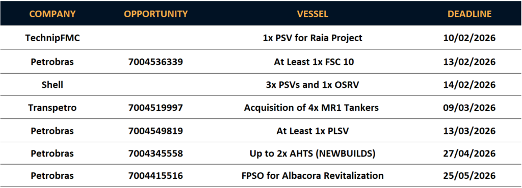 - Petrobras Acquisition of 4x MR1 Tankers: Opportunity 7004519997 new deadline March 9th, 2026.
