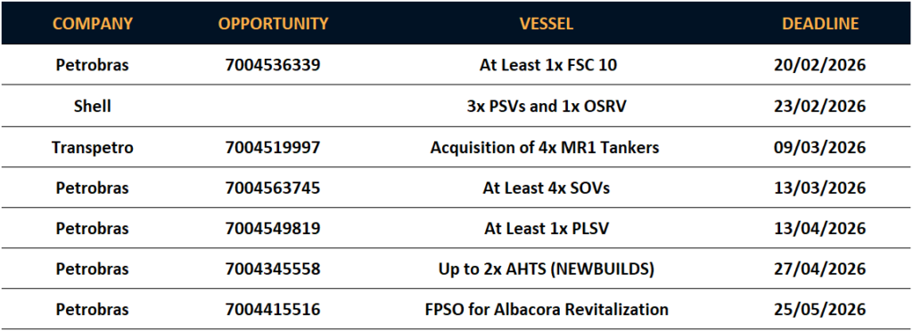 - Petrobras At Least 1x FSC 10: Opportunity 7004536339 new deadline February 20th, 2026.