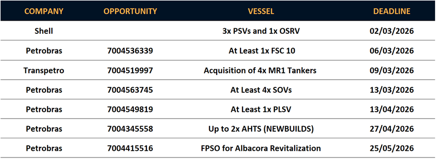 - Petrobras At least 1x FSC 10: Opportunity 7004536339, new deadline March 6th, 2026